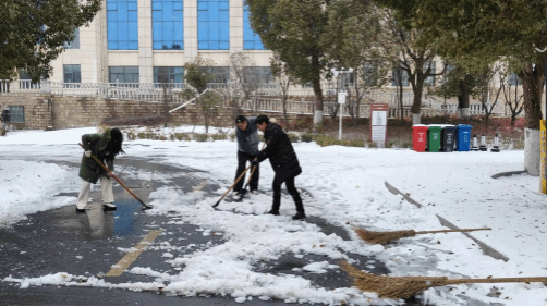 在党总支负责人朱启俊的带领下,党员们纷纷拿起铁锹、扫帚等工具,积极主动地投入到扫雪工作中。大家不畏严寒,团结协作,干劲十足。部分人员负责清理道路上的积雪,部分人则负责铲除冰块,同时还有人员将积雪推移至道路一侧。经过一下午的努力奋战,道路中央的积雪被清扫干净,为师生们开辟了一条安全、畅通的道路。