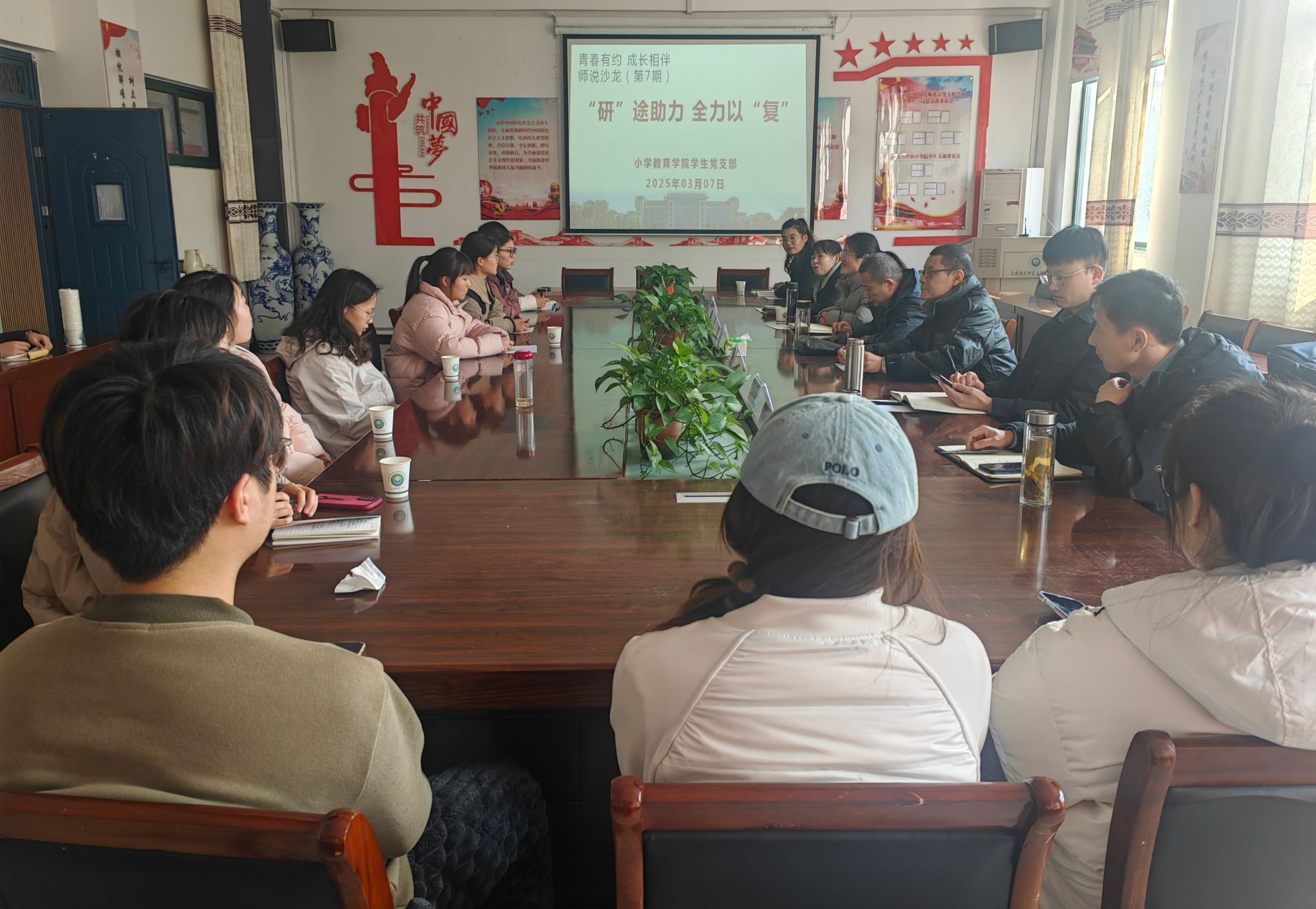 为扎实推进2025届专升本毕业生考研升学工作,全面提升考研学子复试成功率,小学教育学院党总支发挥支部战斗堡垒作用,于3月7日,以“‘研’途助力 全力以‘复’”为主题,在文津楼201举行第7期“师说”沙龙。本期活动邀请到阜阳师范大学教育学院汪杰锋教授一行4人,由院长郭玉敏主持,党总支书记朱启俊、毕业班辅导员及我校2025届考研初试上线的同学参加。