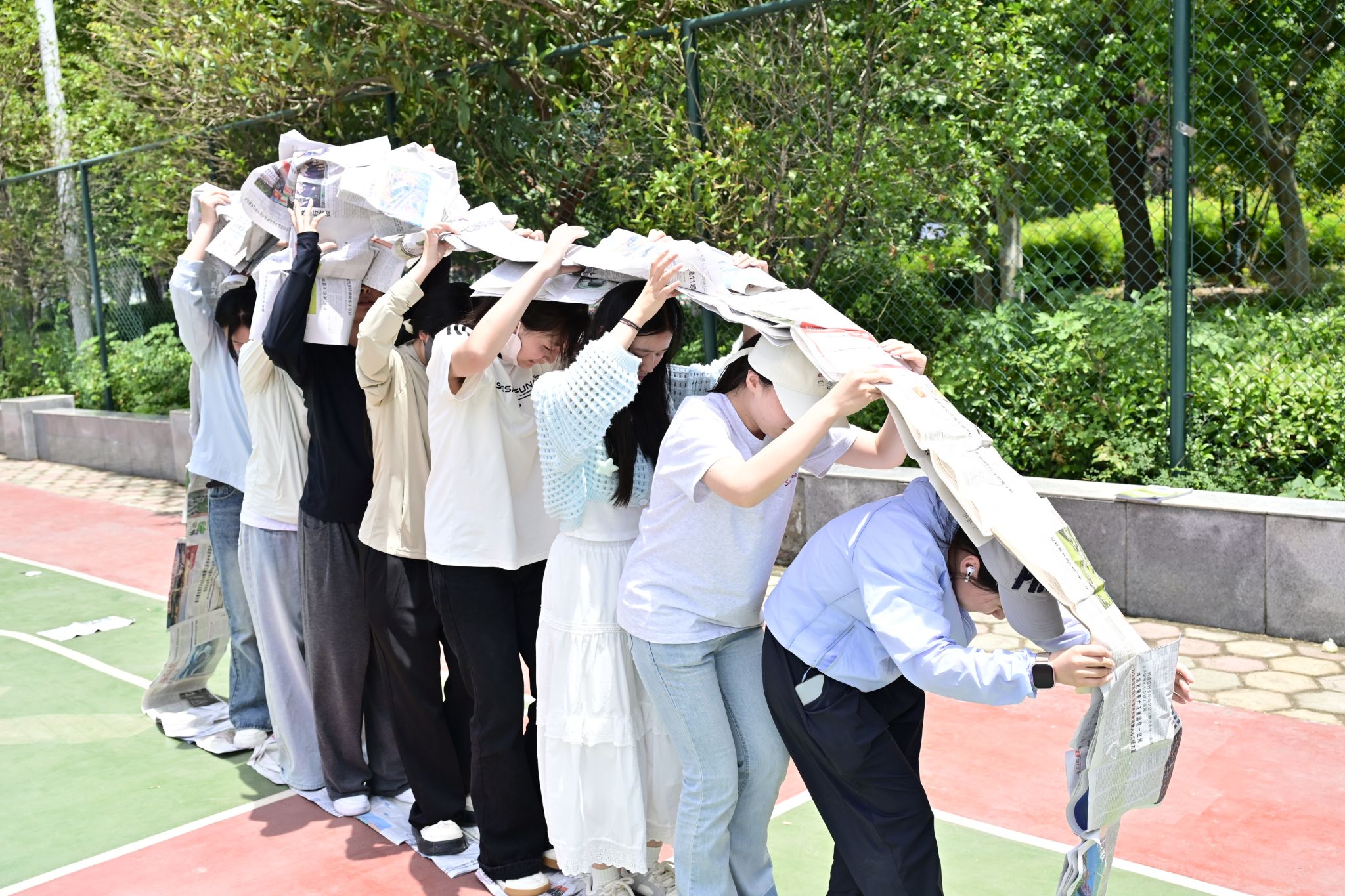 活动以 8 人小组为单位,各团队需用废旧报纸和胶带制作巨型 “风火轮” 履带,并在履带中同步行进完成竞速挑战。现场气氛热烈,加油声此起彼伏:有的团队因步伐失调导致履带断裂,成员们笑着调整策略、重新磨合;有的小组配合默契,履带如飞轮般平稳前行,赢得阵阵喝彩。计时赛中,同学们在肢体协作的趣味中感受团队力量,也在失败与调整中学会接纳挫折、愈挫愈勇。