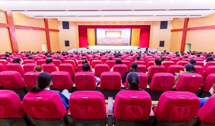 在校领导班子成员、各单位党政负责人在德馨楼演艺大厅收看开幕会直播。