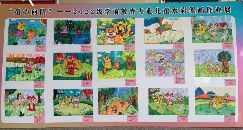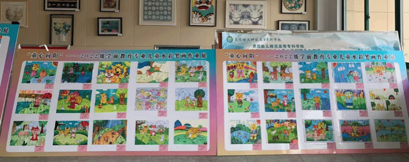 为提高2022级学前教育专业学生的美术基本技能,调动学生的学习积极性,进一步巩固与夯实同学们的专业技能基础,在六一儿童节到来之际,学前教育学院举办了"童心向阳"儿童水彩笔画作品展。