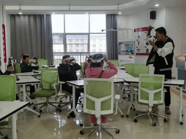 大学生宣讲员姜语童为精神抖擞、学习热情高涨的老“学生们”介绍了虚拟仿真思政课体验教学中心的“党史长廊”设计理念和习近平新时代中国特色社会主义思想的主要内容,带领大家体验了爬雪山等红色VR课程,观看了红色电影。