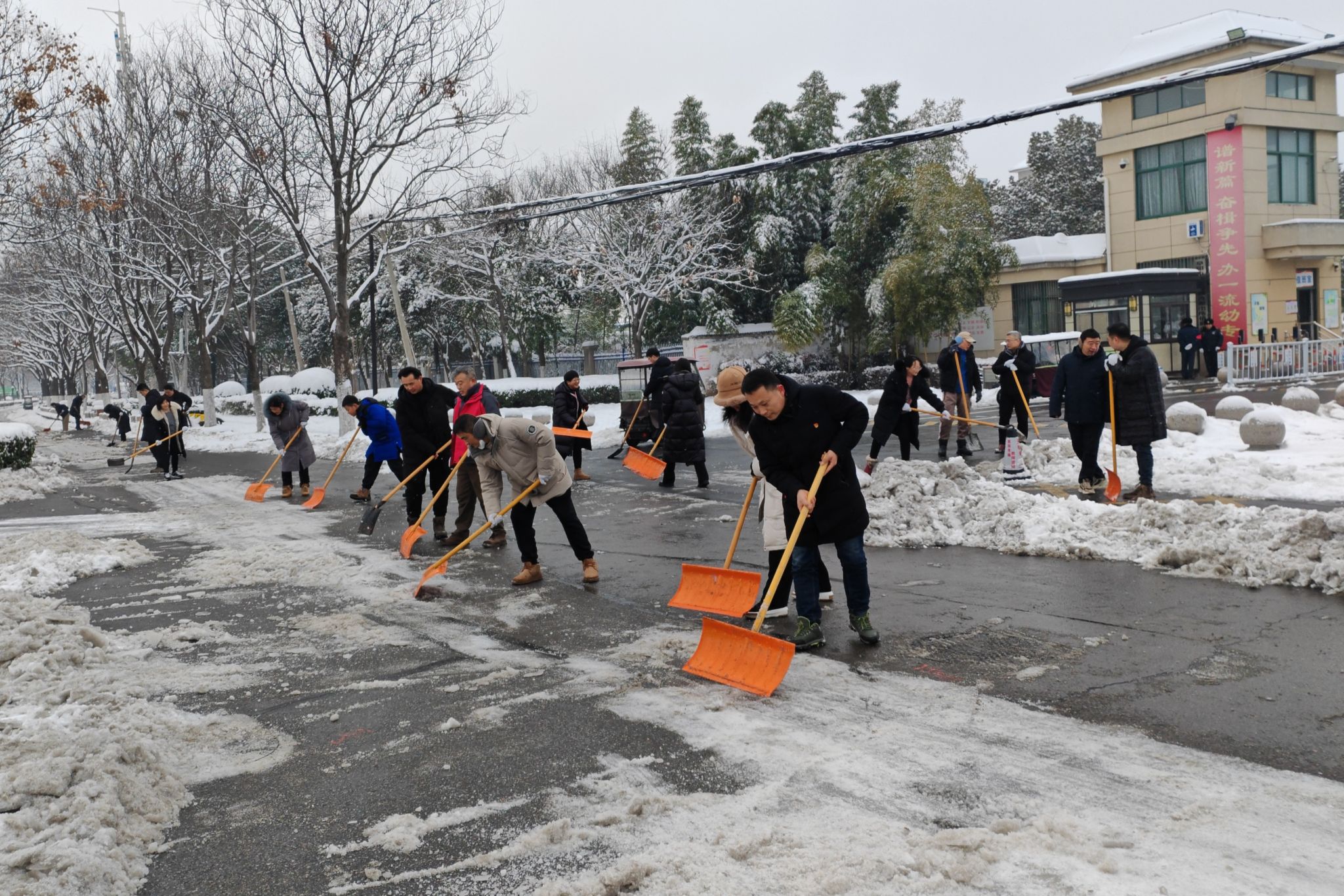活动现场,大家不畏严寒、齐心协力、共同奋战、配合默契,党员们铲的铲、推的推,干得热火朝天、不亦乐乎,忙碌的身影构成了一道道亮丽的风景线。经过一个半小时的集中奋战,整个道路变得整洁且通畅。