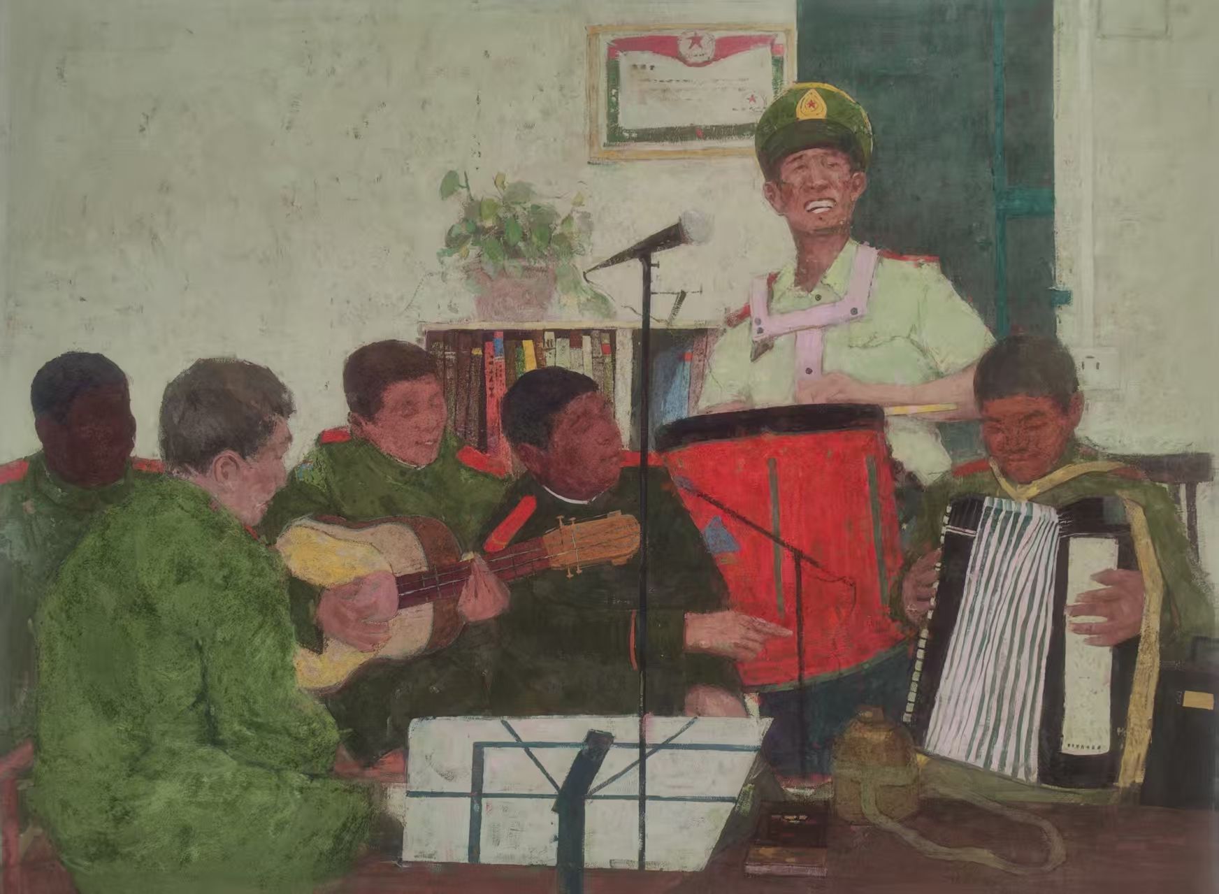本次大展中,阜阳市共有 18 件作品入展,其中 7 件获优秀提名奖,整体成绩位居全省前列。俞超群的获奖作品《四重奏之夏焰》聚焦 “军营文艺活动”这一日常场景,打破了大众对军人 “铁血硬朗” 的单一认知,通过细腻刻画吉他、手风琴、大鼓等乐器,以及奖状、绿植等细节元素,构建出充满生活气息的军营空间,生动传递出“军人既有刚毅品格,更有对艺术的追求与战友间的温情”的创作立意,展现了深厚的艺术创作功底与独特的审美视角。