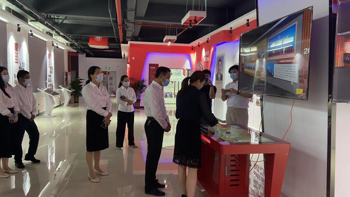 何丽娜介绍了我院虚拟仿真思政课体验教学中心建设情况和我院以虚拟仿真技术为重要应用,打造符合当代青年学习习惯的体验学习内容,实现思政教学的创新突破。王显明一行还参观了红色影院、“印说党史”师生篆刻展,体验了AR魔屏、初心问答学习区 ,学习了“王家坝抗洪救援”“红军爬雪山”“平型关大捷”等虚拟仿真思政课程。