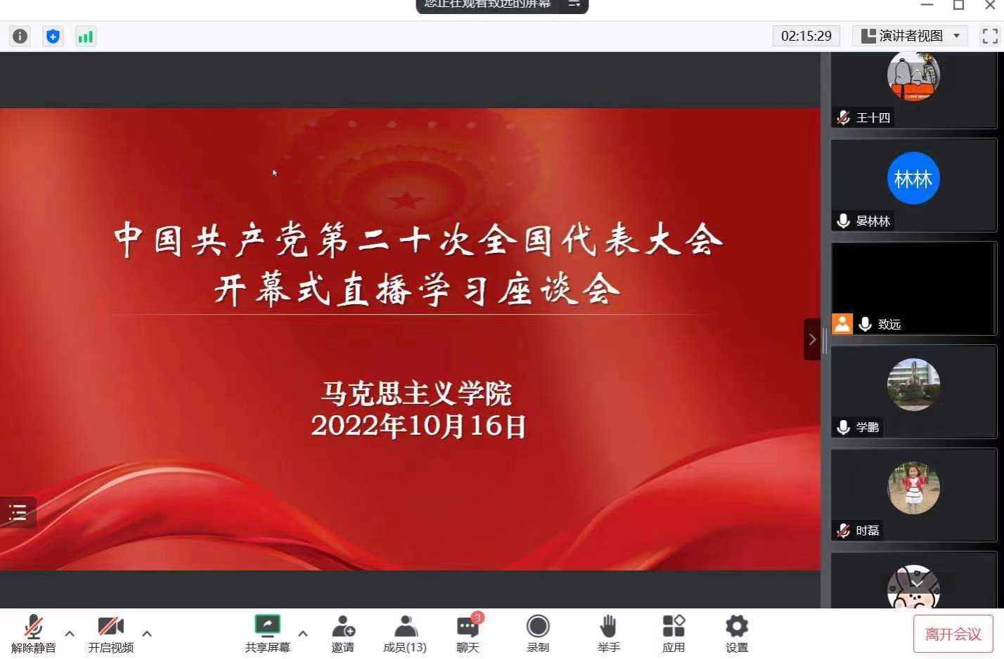10月16日上午10时,举世瞩目的中国共产党第二十次全国代表大会在北京隆重开幕。我校马克思主学院组织全体专兼职思政课教师通过线上会议形式集中收听收看了大会开幕实况直播,认真聆听了习近平总书记代表第十九届中央委员会向大会作的报告。