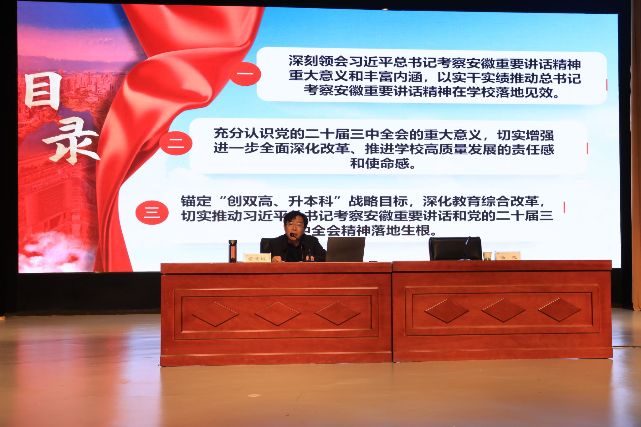 董志诚指出,习近平总书记考察安徽重要讲话精神,对安徽深入贯彻党的二十届三中全会精神,推进深层次改革和高水平开放提出明确要求,为安徽在新时代推进现代化建设提供了战略指引。全校各级党组织和广大党员干部要坚持从政治上看、从政治上学、从政治上悟,深刻领悟习近平总书记考察安徽重要讲话和党的二十届三中全会精神的核心要义,切实把总书记的期望转化为奋斗目标、嘱托转化为实际行动,扛稳为党育人、为国育才的使命担当,推进学校高质量发展。