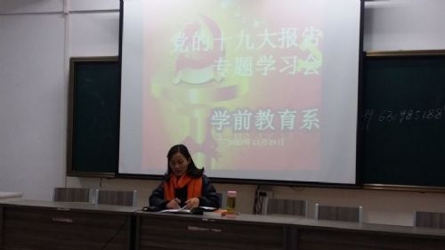 11月29日下午两点半,学前教育系“十九大报告专题学习会(二)”在行知楼二楼北多媒体教室再次开展。全系教师、各班辅导员、班主任参加学习会,系主任钱友莲主持会议。