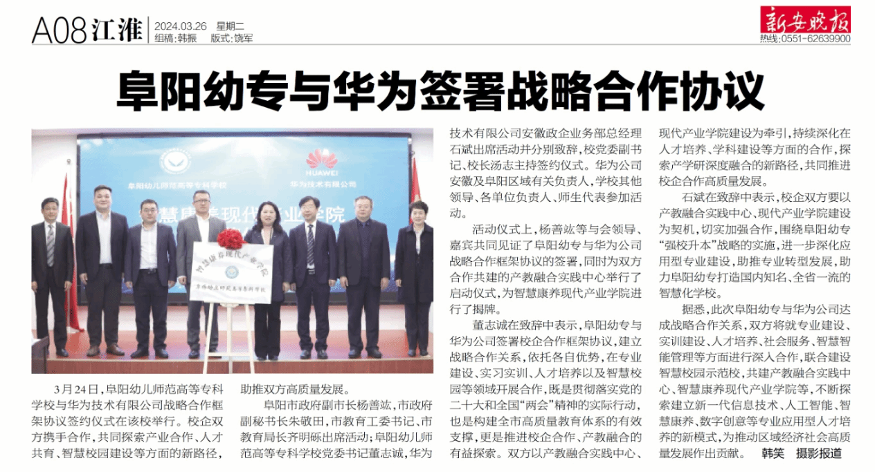 1.中共安徽省委教育工委、安徽省教育厅官网:校企合作同发展 产教融合谱新篇 久久久一区二区三区|亚洲精品一区二区三区不|久久av网|精品国产一区二区三区久久久久久|午夜精品av|久久久久久久久久久久久久av|日韩亚洲欧美综合扎实推进校企合作 2.新安晚报:阜阳幼专与华为签署战略合...