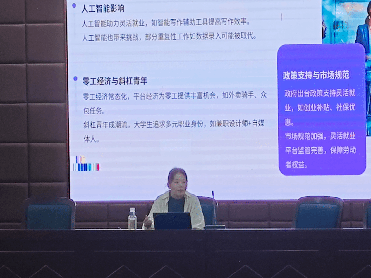 胡雪丽老师结合当前就业市场数据,分析了高校毕业生面临的机遇与挑战。她指出,随着数字经济、共享经济等新业态的蓬勃发展,灵活就业已成为年轻人职业选择的重要方向。围绕灵活就业的常见形式,胡老师以生动的案例介绍了自由职业、远程办公、技能共享、新媒体创业等热门领域,并深入剖析其优势与潜在挑战。她特别提醒学生:“灵活就业需要更强的自我管理能力和风险意识,建议同学们结合专业特长提前储备技能,善用政策资源搭建职业‘安全网’。” 讲座尾声,胡老师以“在变革中锚定方向,在探索中创造可能”寄语在场学生,引发热烈掌声。参与学生纷纷表示,通过讲座不仅了解到就业市场的前沿动态,更对如何将个人兴趣与市场需求结合有了新思考。